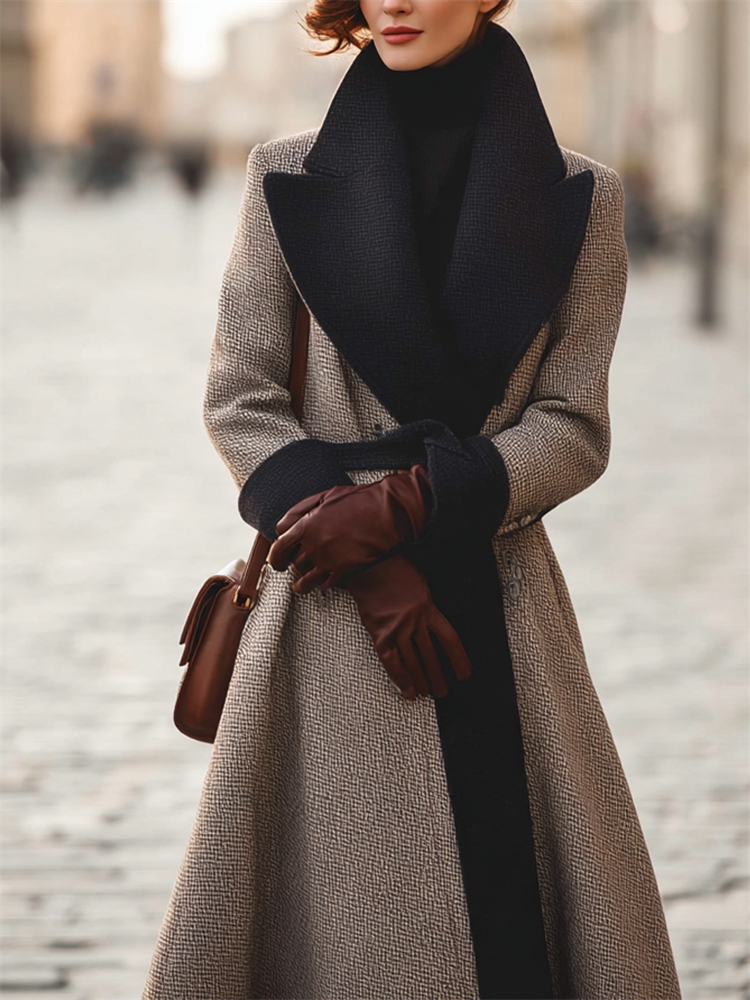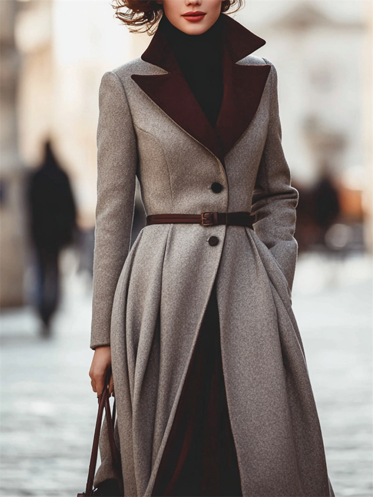 Vintage Classy Contrast Belt Wrap Wool Coat