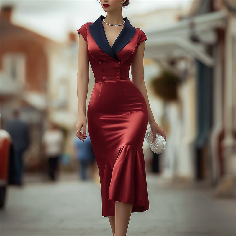 Classy Vintage Contrast Color Satin Maxi Dress