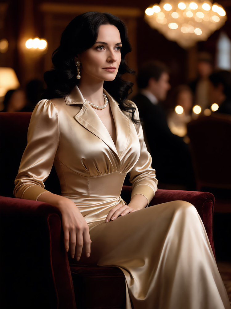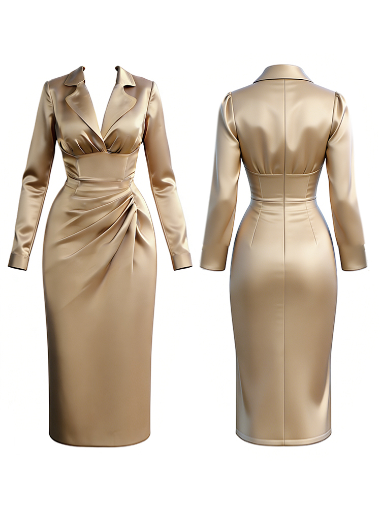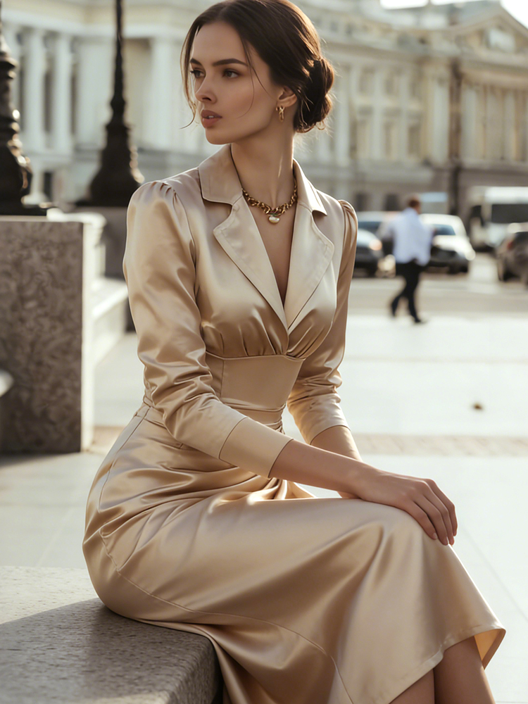 Classy Vintage Pinched Satin Maxi Shirt Dress