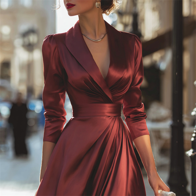 Classy Wrap Pleated Flowy Satin Maxi Dress
