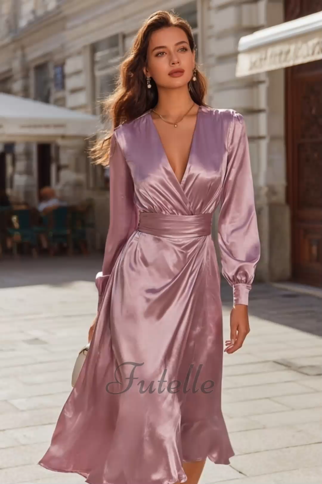 Elegant Long Sleeve Flowy Satin Maxi Dress