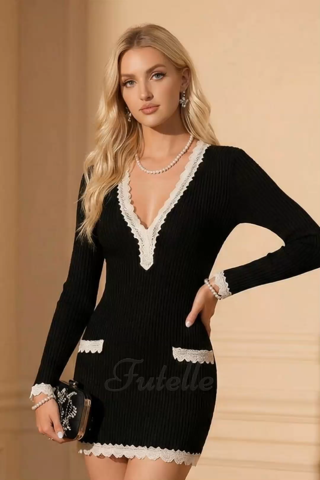 Elegant Temperament V-neck Fashion Lace Trim Fitted Long Sleeve Hip-hugging Dress