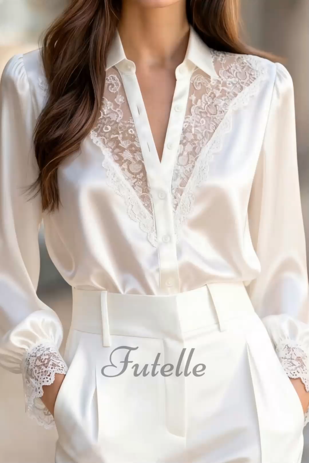 Fashion Patchwork Lace V-neck Puff Sleeve Shirt