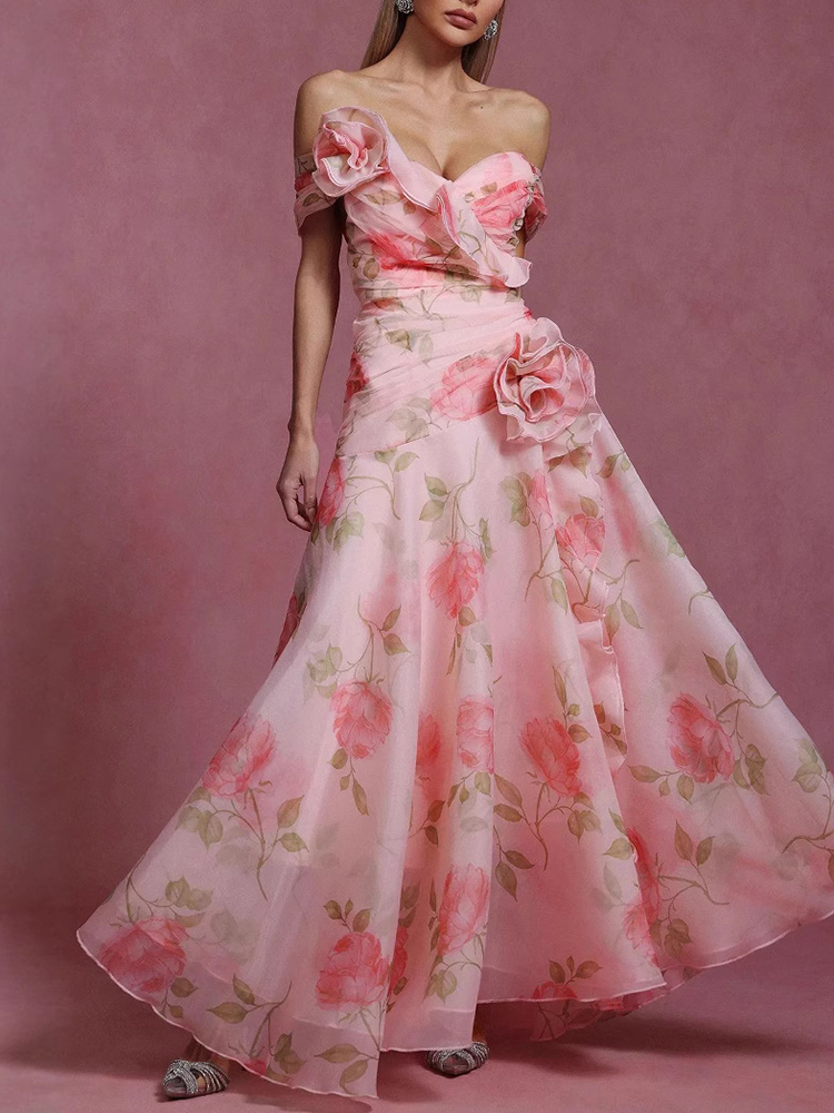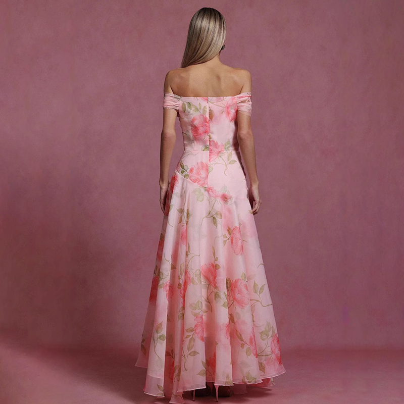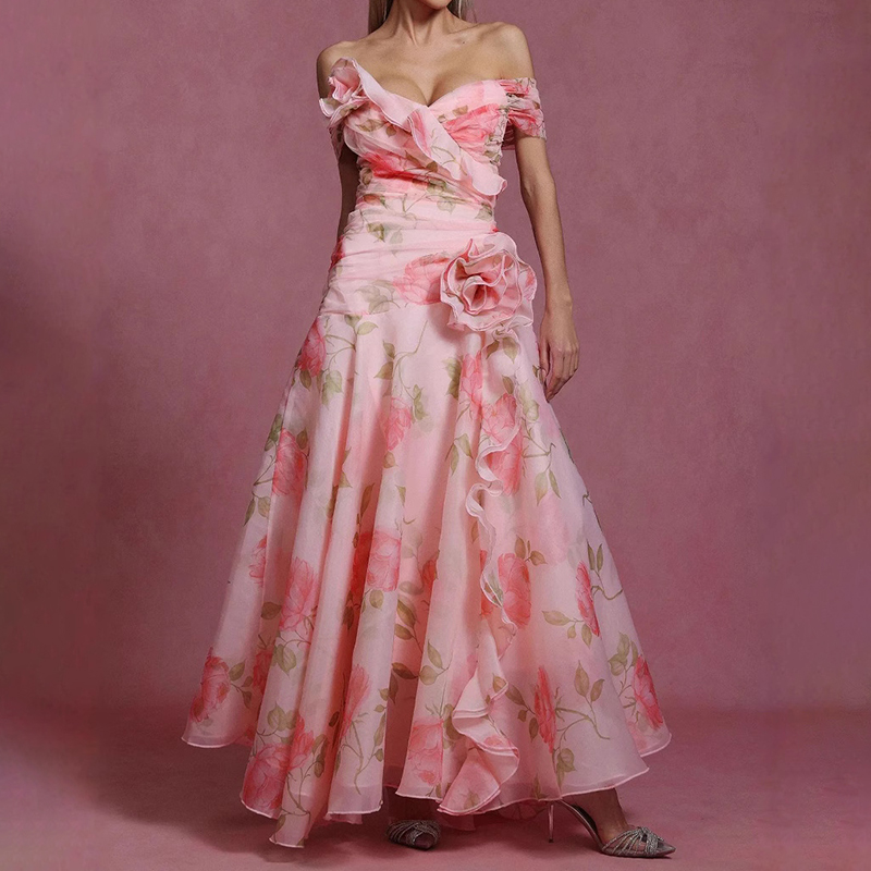 French Retro Floral Waist Casual Printed Off Shoulder Dress