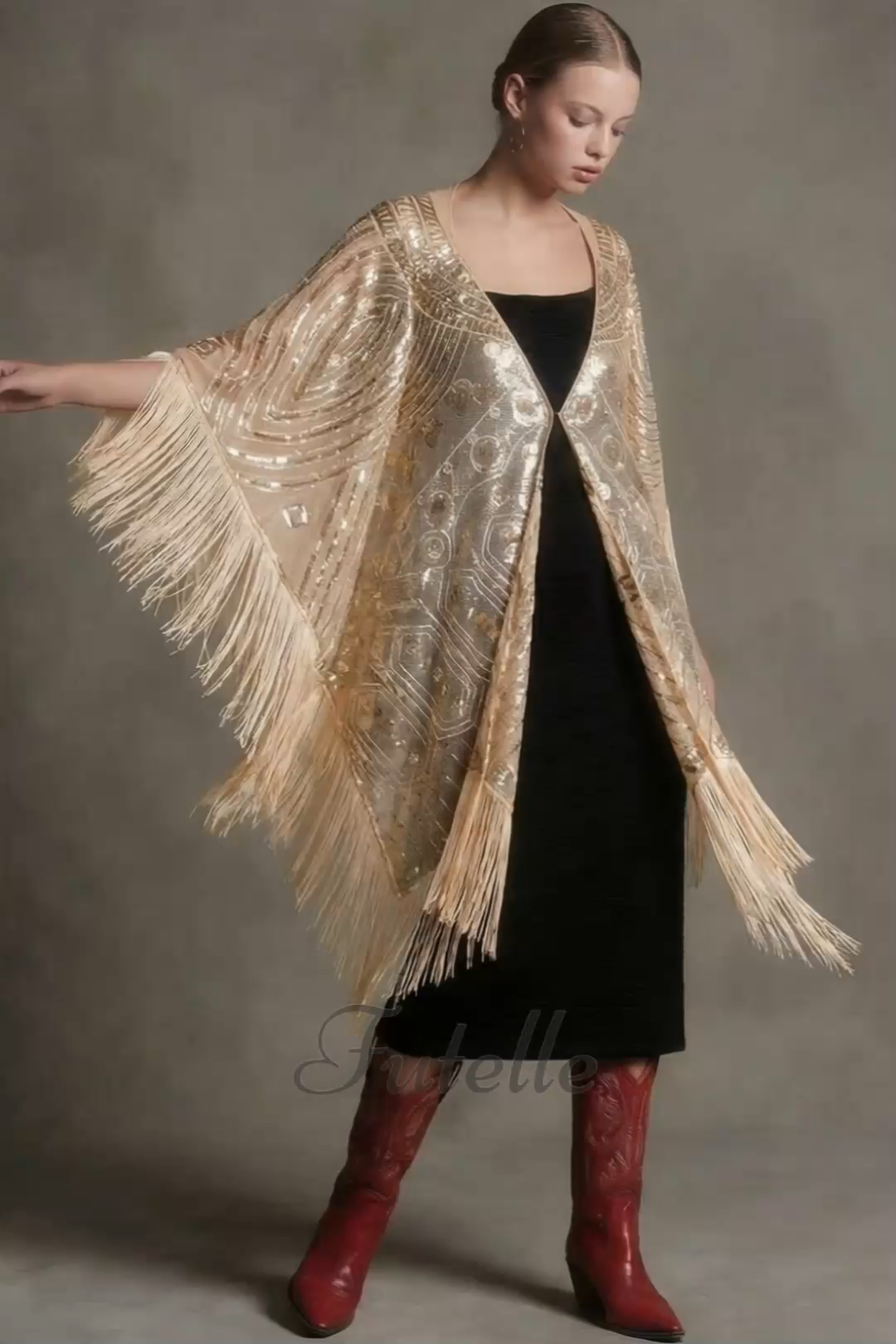 Vintage 1920s Elegant Sequins Tassel Fringe Women's Poncho Kimono