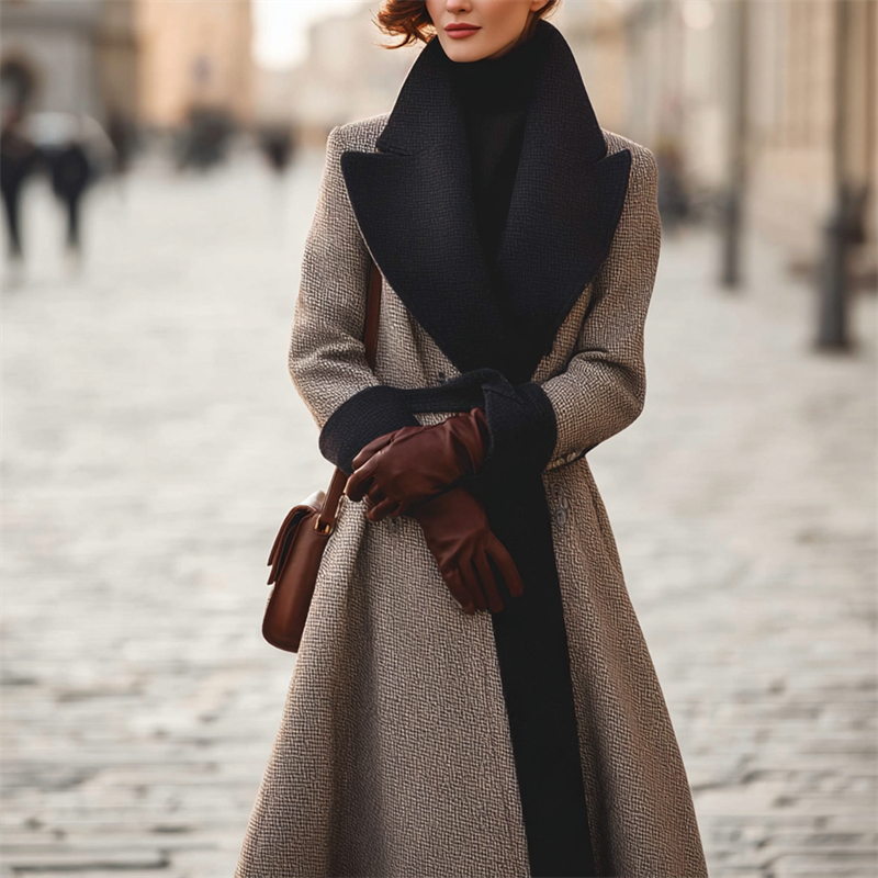Vintage Classy Contrast Belt Wrap Wool Coat